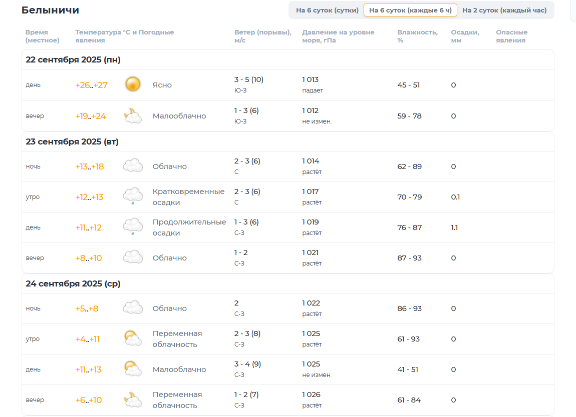Предварительно, в начале второй половины недели погоду станет определять Скандинавский антициклон и холодный воздух с севера. Переменная облачность. Без осадков. Ночью и утром слабый туман. Ветер северной четверти, умеренный. Влажность до 70 процентов. Ночью от +3 до +7 градусов. Днем в четверг +11…+16, в пятницу +10…+14 градусов.