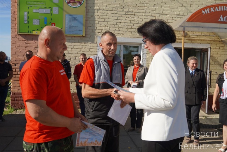 Поздравить передовиков жатвы-2025 приехали председатель райисполкома Ольга Пристромская, лидеры райорганизаций профсоюза работников АПК Алеся Новиченок и РОО «Белая Русь» Жанна Звягина.
