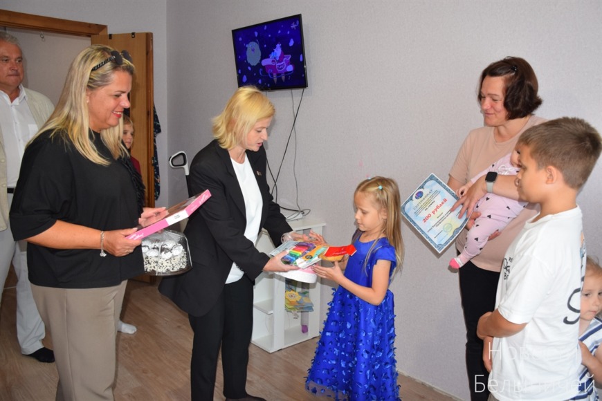 Гости вручили ребятам денежный сертификат на 200 рублей, канцелярские принадлежности и сладкие подарки.